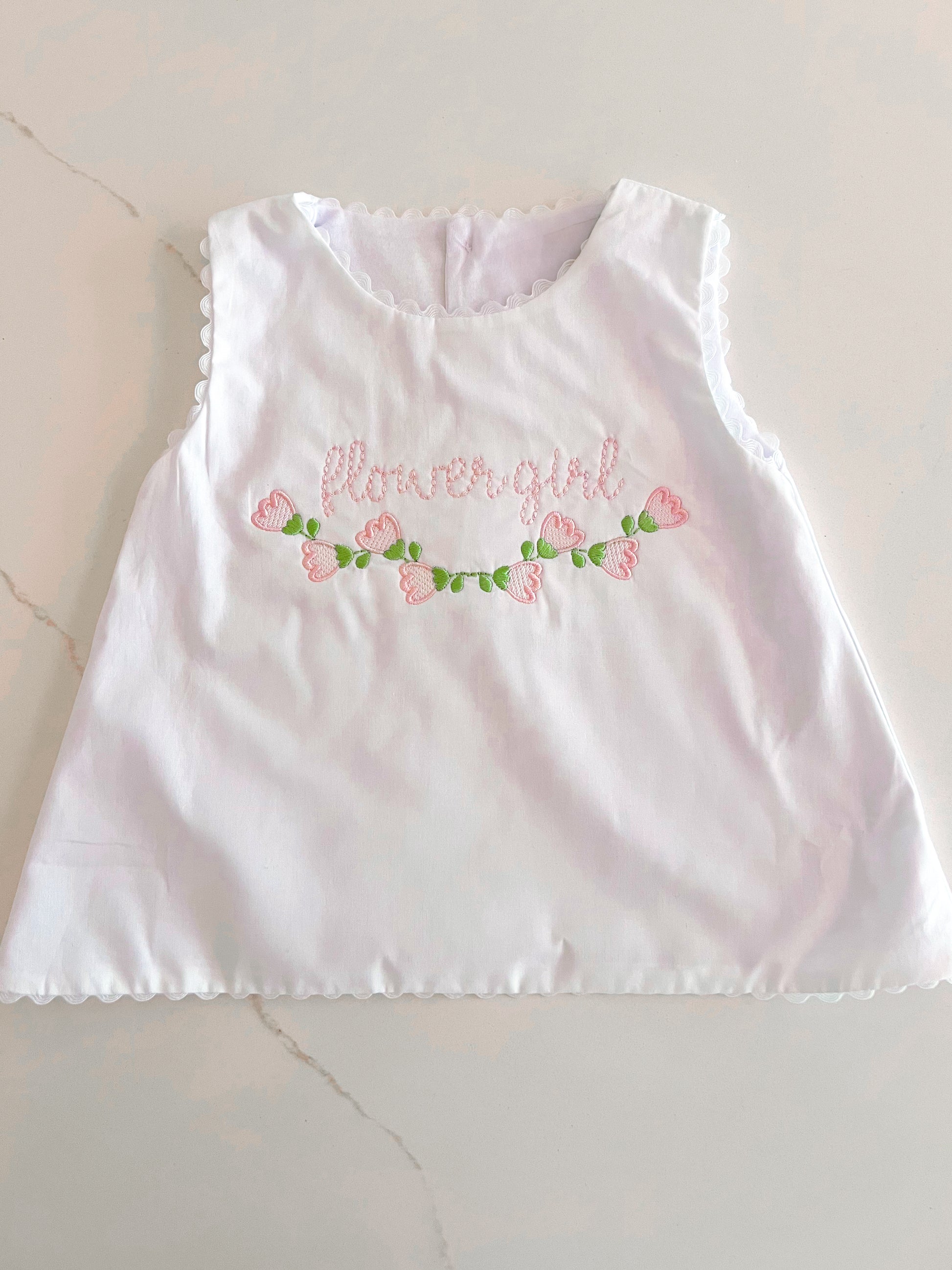 Adorable swing back white woven cotton diaper set with white ricrac trim. Lined with soft knit cotton